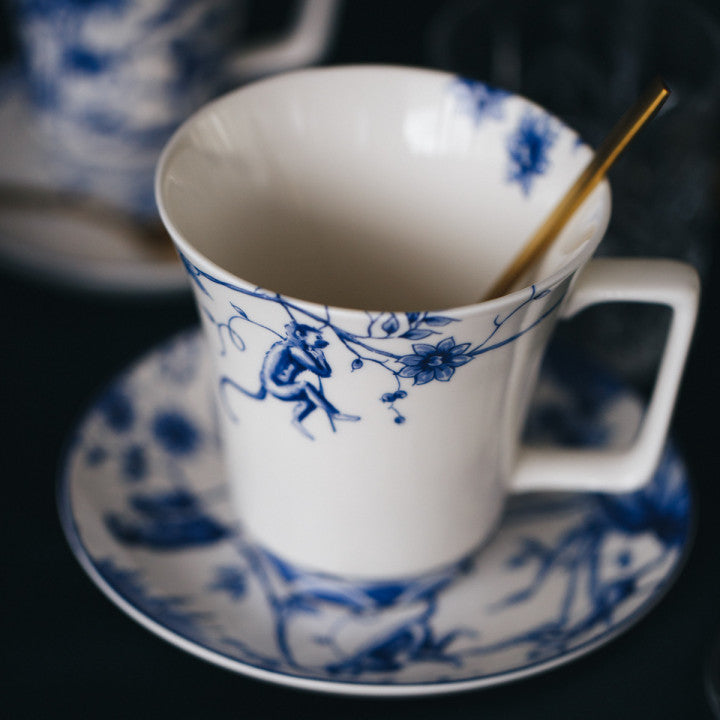 Geniet van een kopje thee met een knipoog dankzij deze speelse theemok met Aapjes-decor van Heinen Delfts Blauw. Uitgevoerd in hoogwaardig porselein en gedecoreerd met een vrolijk Delfts blauw patroon.