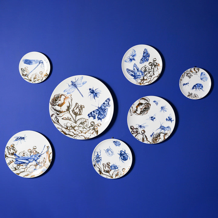 Dit decoratieve bord heeft een diameter van 31 cm en heeft verschillende handbeschilderde insecten, in het kenmerkende blauw-wit design.