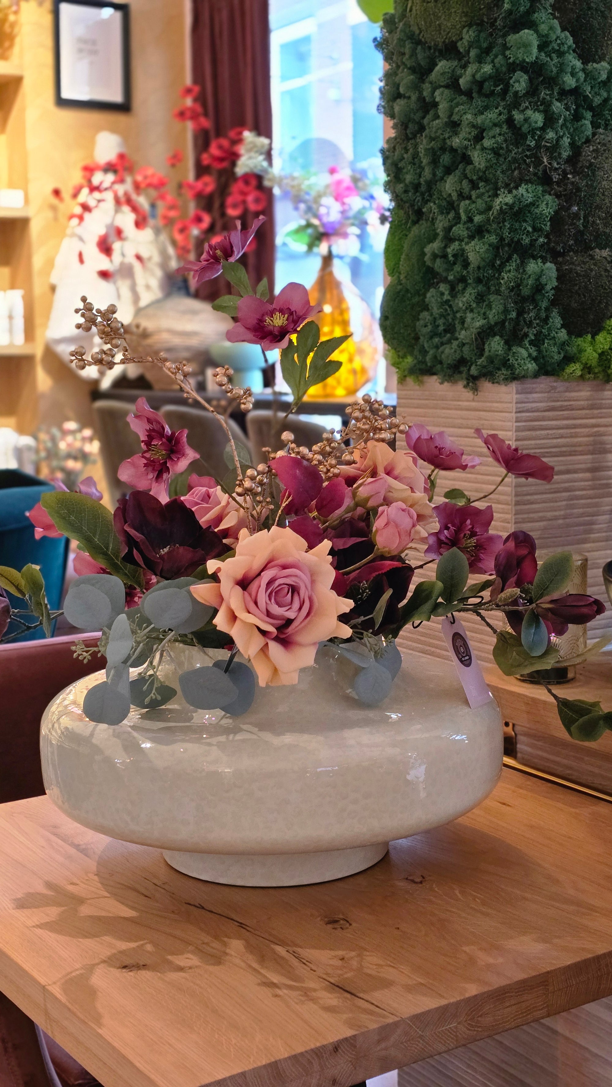Maak kennis met het zijden boeket Aimy, het zusje van boeket livia. Beide opgemaakt in de prachtige ivoor kleurige vaas, maar gewisseld van seizoen!