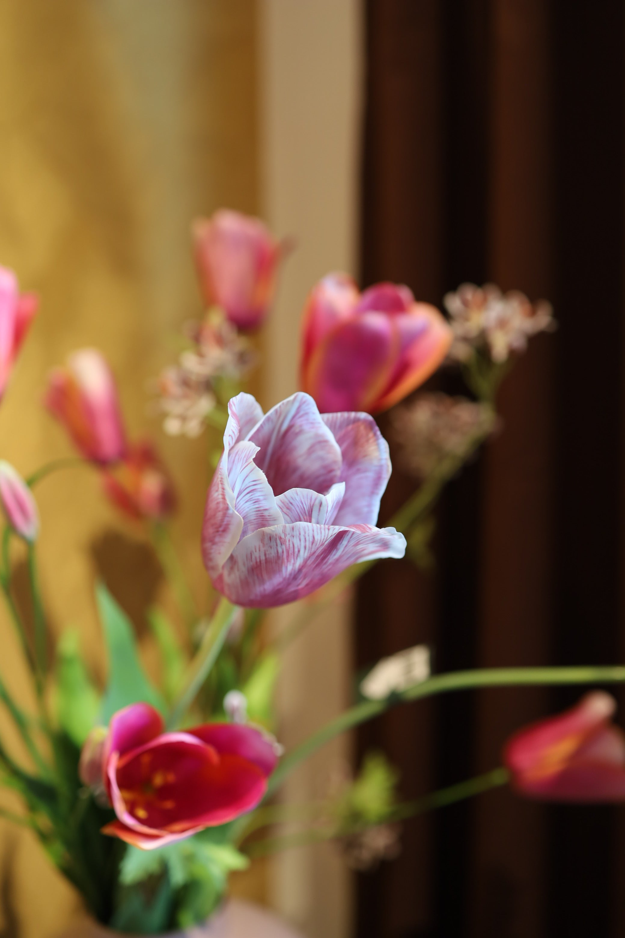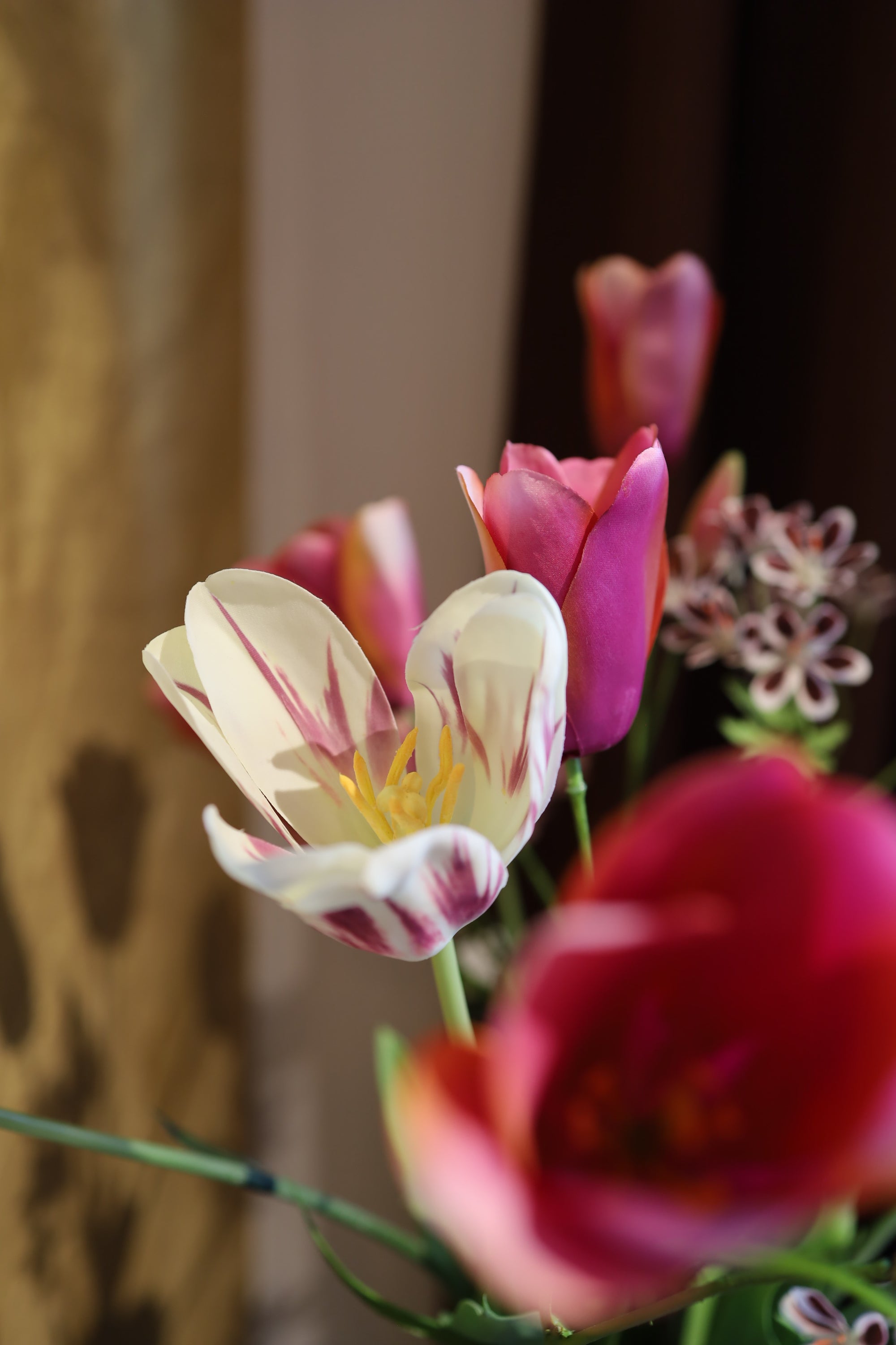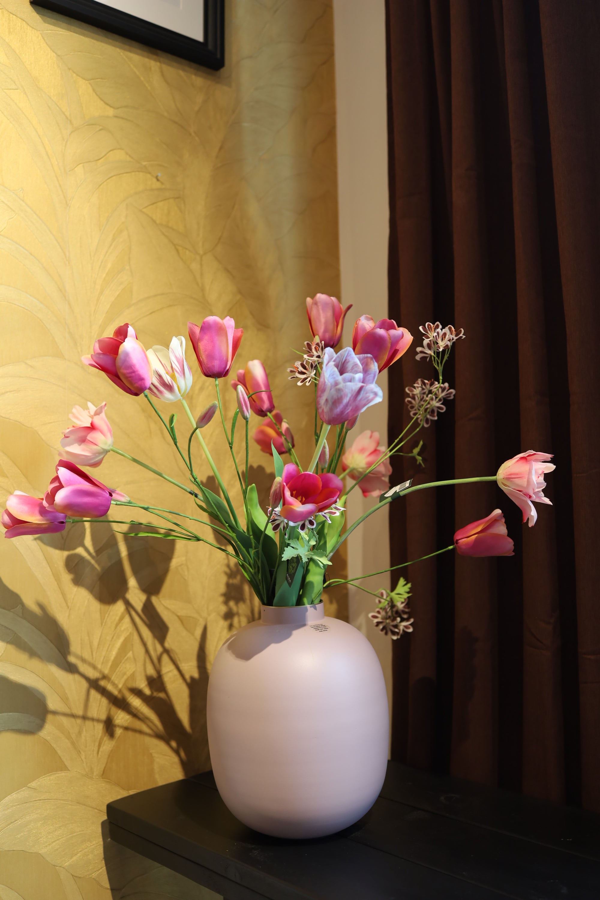 Ontdek ons prachtige boeket van zijden bloemen met real-touch tulpen. Met een verfijnde uitstraling en unieke details brengt dit boeket sfeer en elegantie in elk interieur. Ideaal als duurzaam alternatief voor verse bloemen!